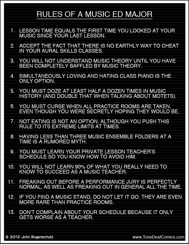 Even majoring in music education requires an increased time commitment. Did you know that many music ed programs are actually 5 years? For a BME… I remember having to take twice as many classes as my college boyfriend, a business major, who would be sure to make double my salary right out of college. And yet, we were required to take like, 6 music theory classes, 4 music history classes, in addition to our general and music education classes, our private lessons, our ensemble credits (0 credit hours) AND many expected us to keep the same performance standards as performance majors. Oh, and this often includes ZERO courses on classroom management (perhaps the most important class for any music teacher)… These expectations and requirements are a huge attrition factor and an even bigger deterrent for any student who does his/her research before starting a music ed degree.